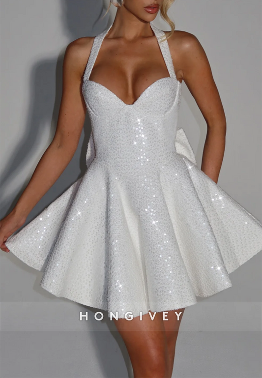 Halter Crisscross Back Glitter Sleeveless A-Line Square Neck Mini Homecoming Dresses