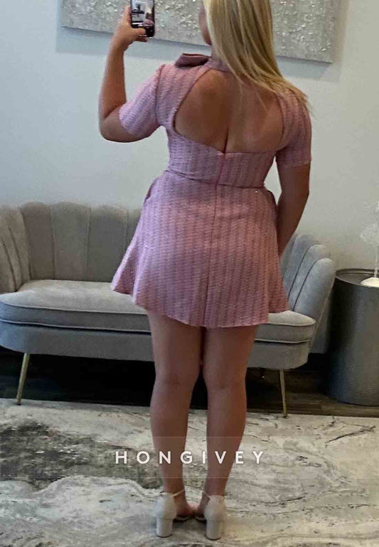High Neck Short Sleeves Back Hole Short Homecoming Dresses with Bowknot