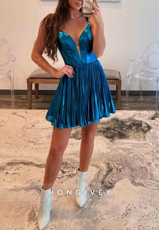 Cute A Line Spaghetti Straps Blue Satin Pleated Short Homecoming Dress