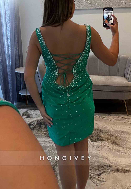Regular Straps Tie Back V-Neck Sheath Mini Homecoming Dresses with Beading