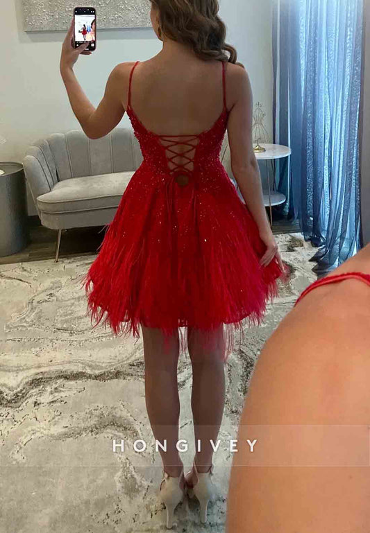 Red Spaghetti Straps Tie Back Beading A-Line Short Homecoming Dress with Feather