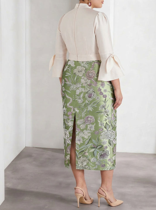 A-Line/Princess Scoop Printed Satin Plus Size Mother of the Bride Dresses Half Sleeves Floral Tea-Length Sash