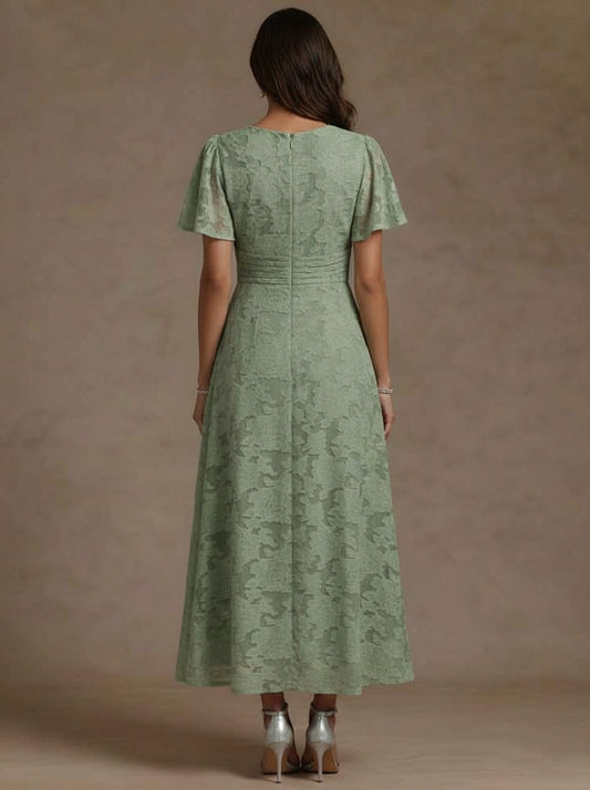 A-Line/Princess V-Neck Floral Burnout Mother of the Bride Dresses Short Sleeves Ankle-Length Ruched