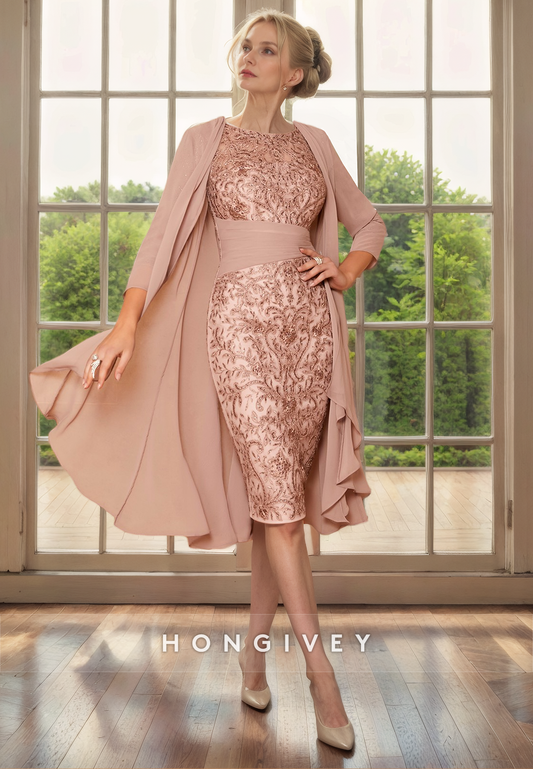 Fitted Round 3/4 Sleeves Appliques Two Piece Mother of the Bride Dress