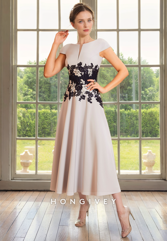 Classic Fitted Round Cap Sleeves Lace Applique Mother of the Bride Dress
