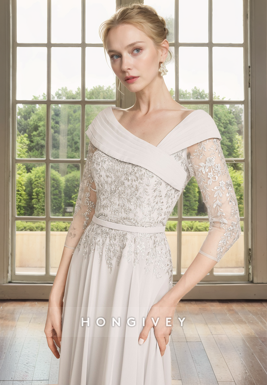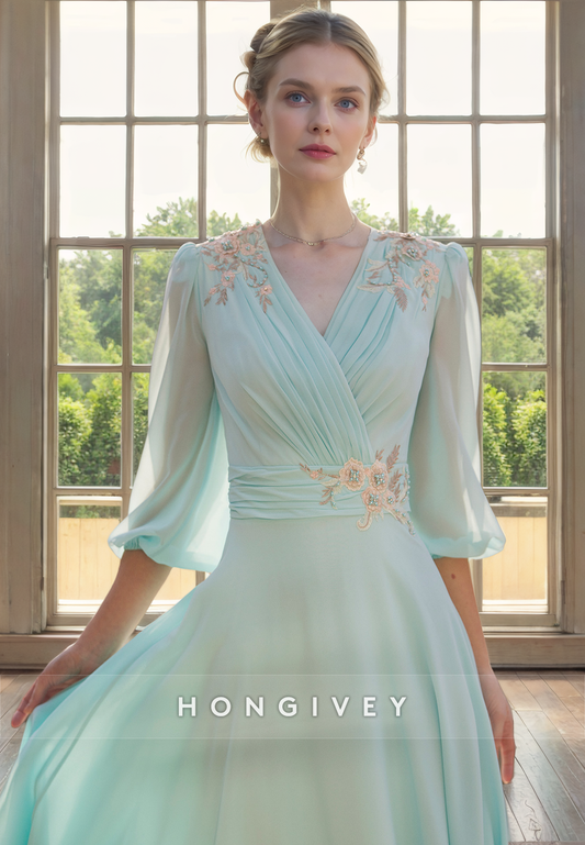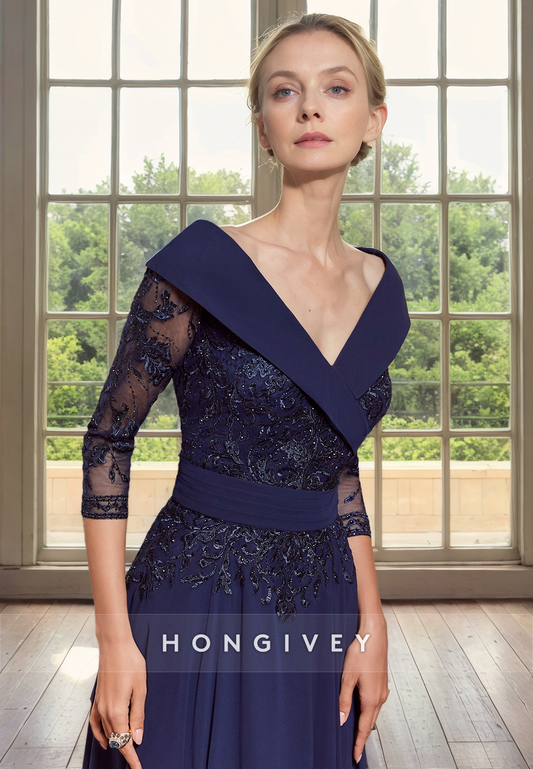 Classic V-Neck 3/4 Sleeves Lace Applique Mother of the Bride Dress
