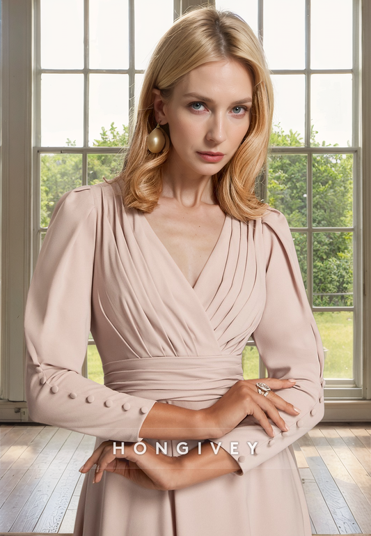 Elegant Chiffon A-Line V-Neck Long Sleeve Ruched Mother of the Bride Dress