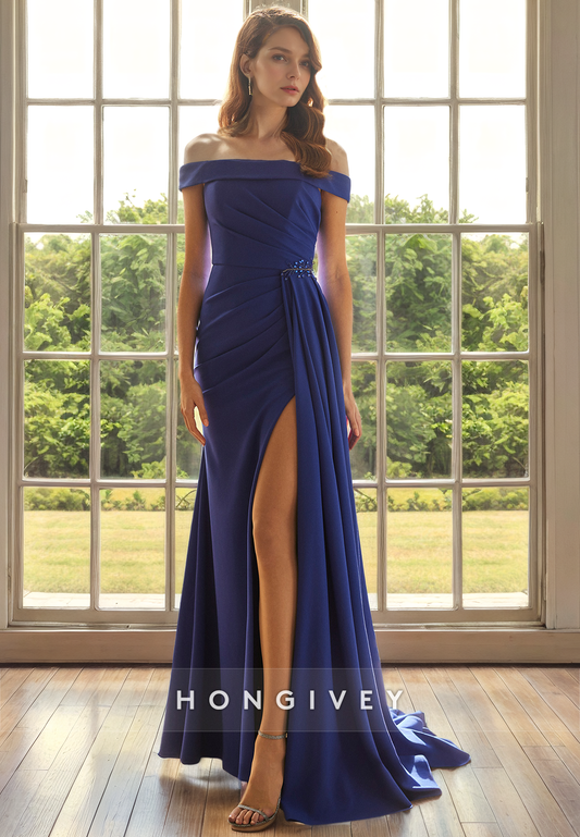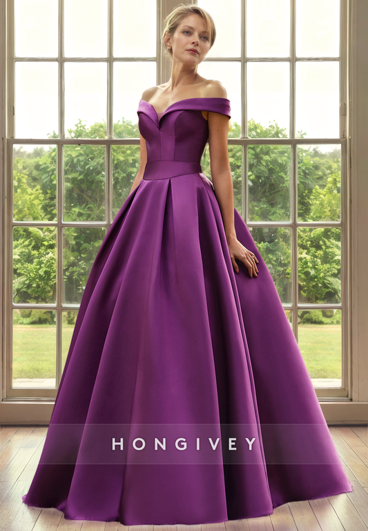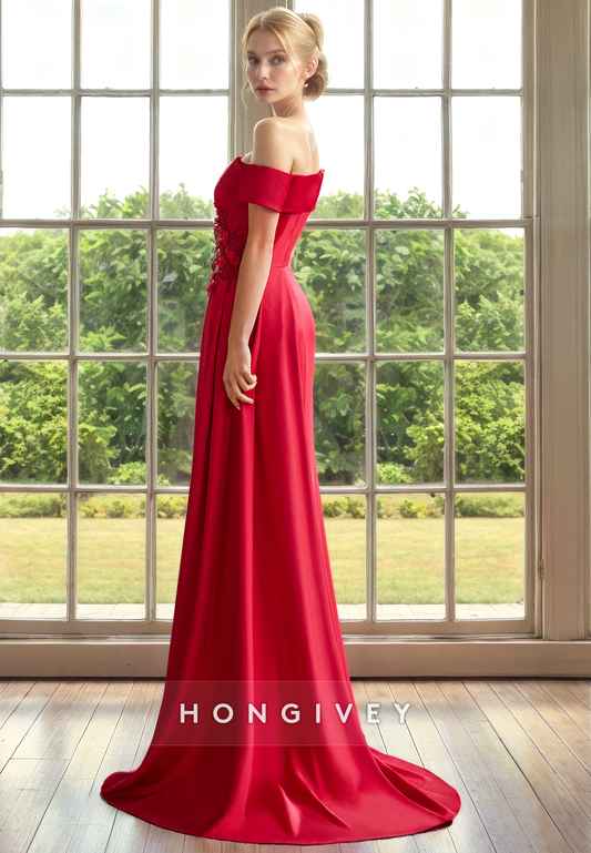 Satin A-Line Off-Shoulder With Side Slit Mother of the Bride Dress