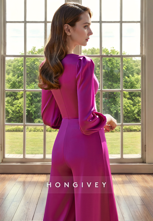 Classic Satin V-Neck 3/4 Sleeves Empire Jumpsuit Mother of the Bride Dress
