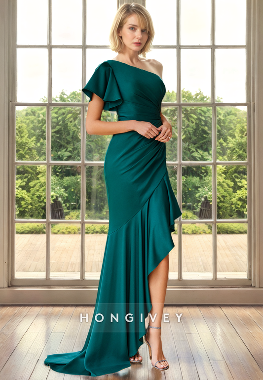 Trumpet One Shoulder Empire Ruffled With Slit Mother of the Bride Dress