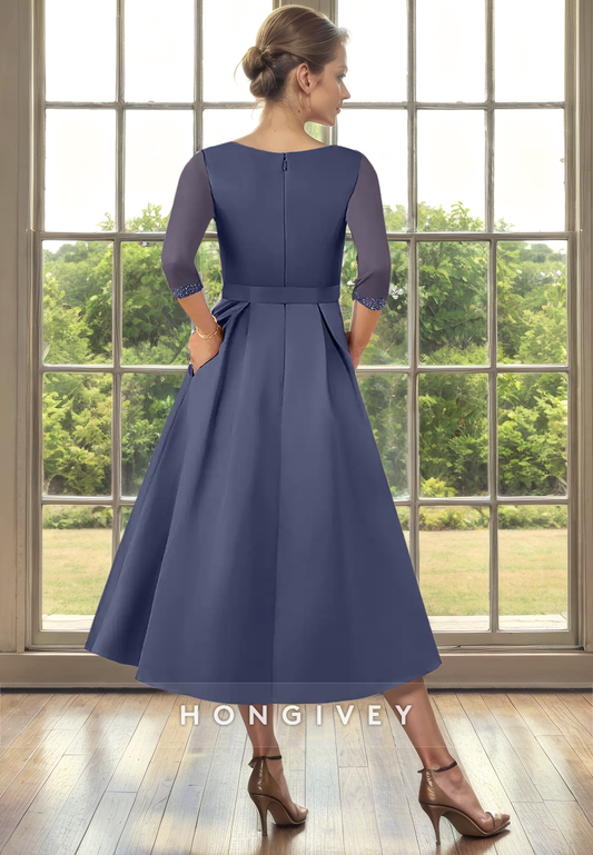 Satin A-Line V-Neck 3/4 Sleeves Belt Mother of the Bride Dress