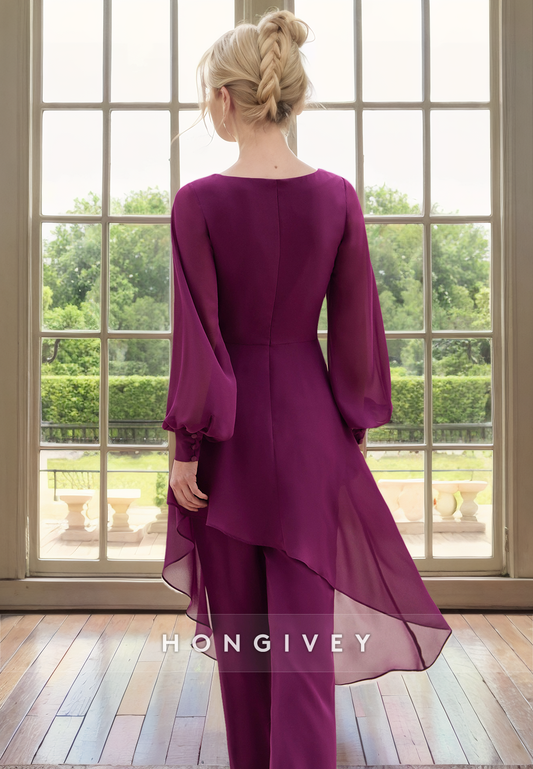 Chic V-Neck Long Sleeve Empire Beaded Jumpsuit Mother of the Bride Dress