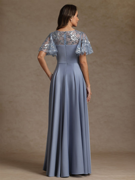 A-Line/Princess V-Neck Stretch Satin Mother of the Bride Dresses with Split Side Lace Floor-Length Short Sleeves