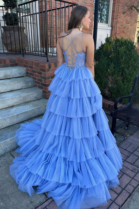 Light Blue A-Line Spaghetti Straps Lace Up Long Tiered Tulle Prom Dress