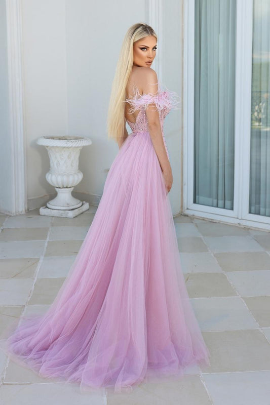 Off the Shoulder Backless Feather Tulle Court Trai Prom Dress Sequins Sprkle
