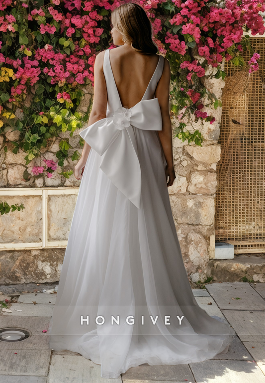HONGIVEY V-Neck Satin Wedding Dress Sleeveless A-Line Bridal Dresses