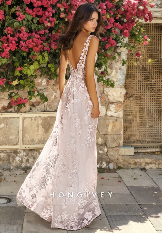 Lace Applique V-Neck Sleeveless Tulle A-Line Beach Wedding Dress