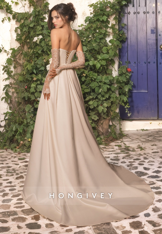 HONGIVEY Strapless Satin Wedding Dresses Side Slit Simple Trumpet Wedding Gown