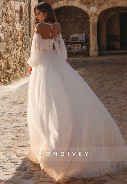 A-Line Sweetheart Long Sleeve Lace Applique Tulle Wedding Dress