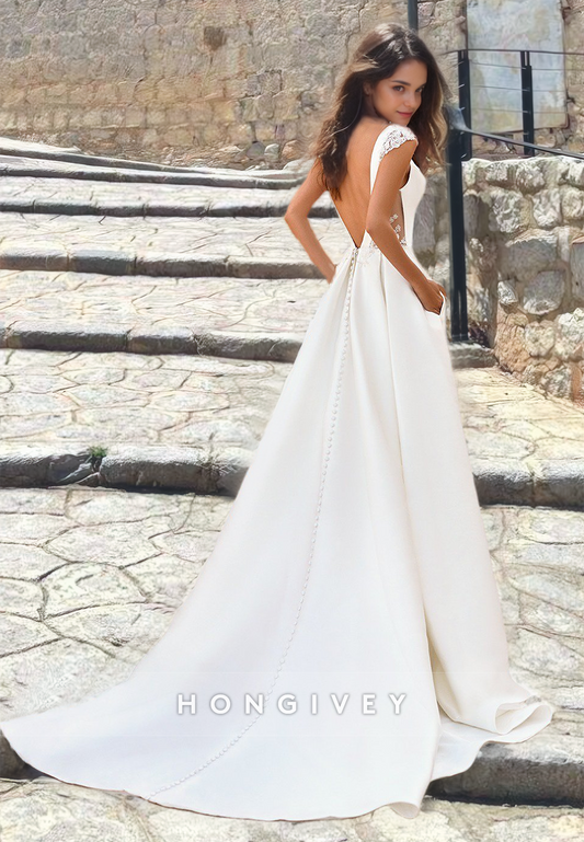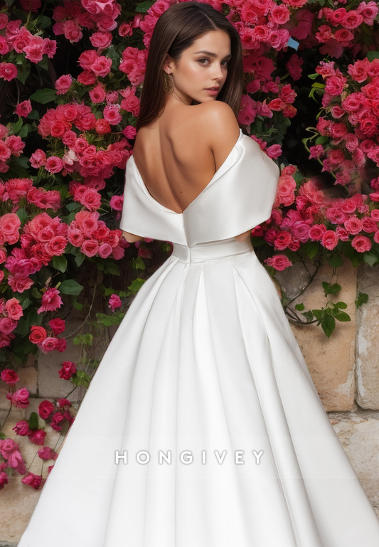 Simple Backless Off-Shoulder Wedding Dresses A-Line with Train Satin Bridal Dresses