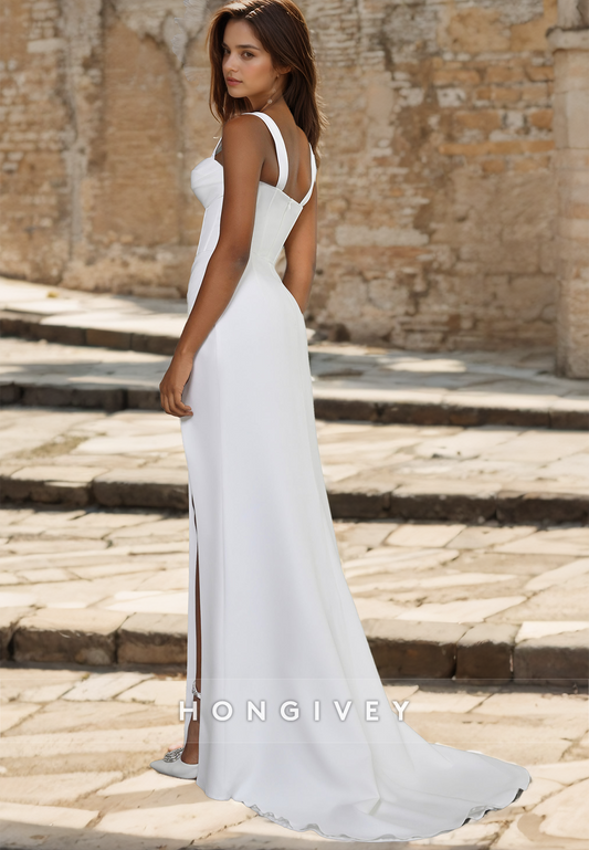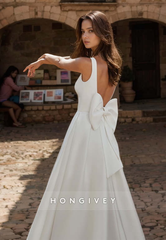 A-Line Square Satin Wedding Dresses with Bow Formal Backless Side Slit Straps Bridal Dress