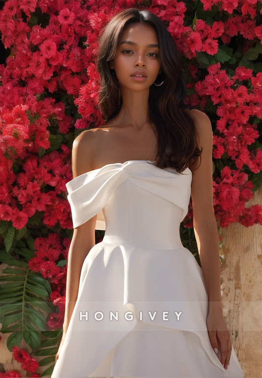 HONGIVEY Satin Beach Wedding Dresses with Train Simple Off-Shoulder High Slit Bride Gown