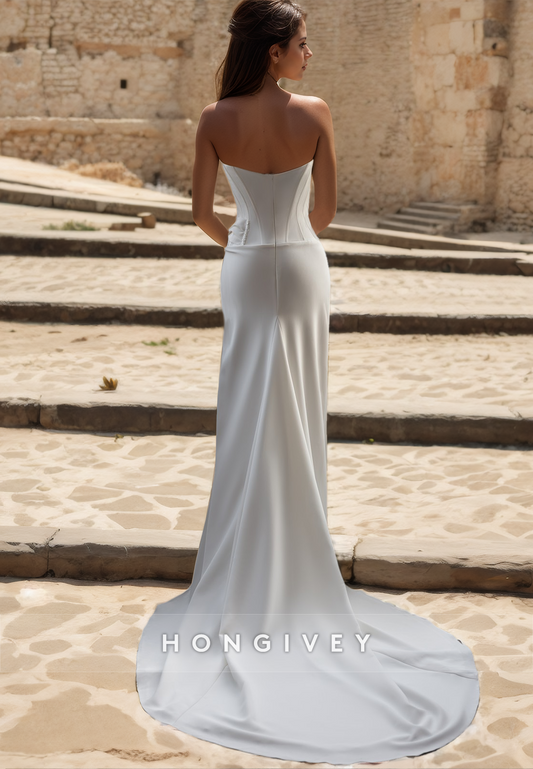 Simple Ruched Trumpet Wedding Dresses Strapless Sweetheart Side Slit Long Bridal Dresses