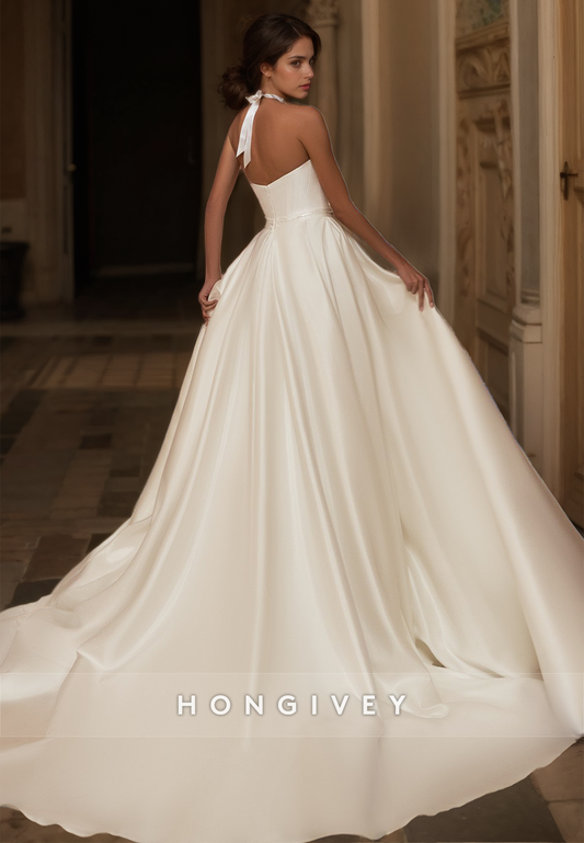 Fashional Champagne Halter A-Line Wedding Dress with Bow Satin Bridal Dresses