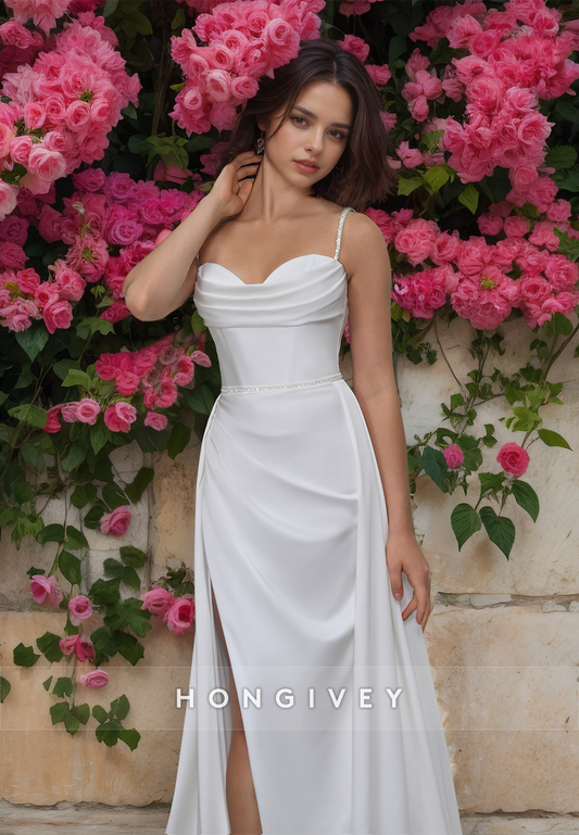 Satin Trumpet V-Neck Spaghetti Straps With Side Slit Wedding Dress