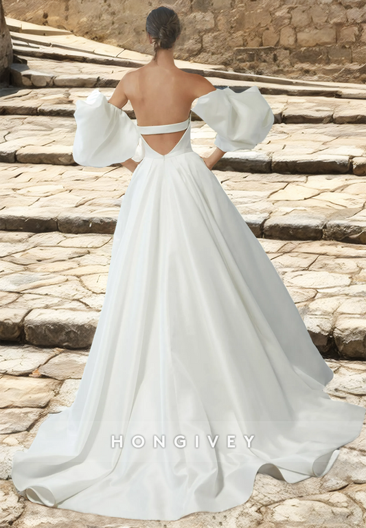 Chic Satin A-Line Sweetheart Puff Sleeves Wedding Dress