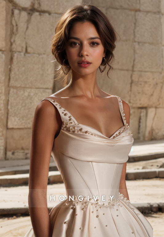 HONGIVEY New Satin Wedding Dresses with Train Straps A-Line Beaded Wedding Gown