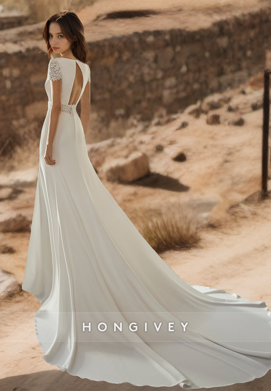 HONGIVEY Beach Wedding Dress with Train Square Short Sleeves Bridal Dresses