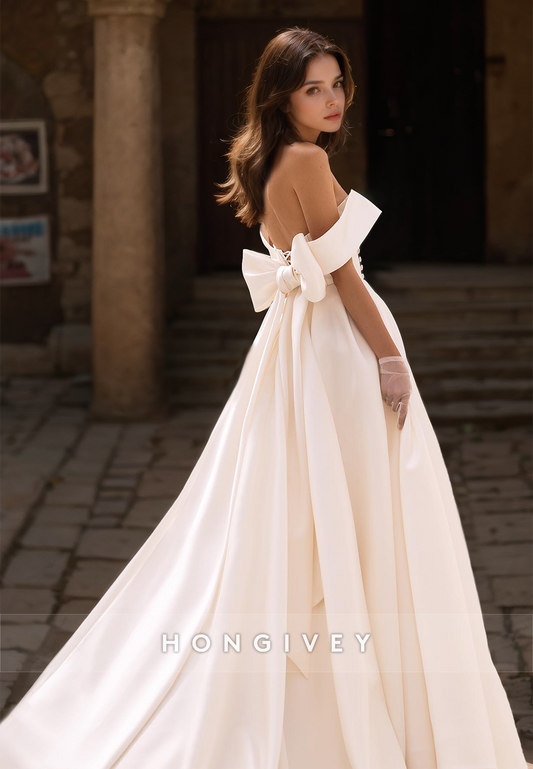 HONGIVEY Backless Satin Wedding Dresses Off-Shoulder Sweetheart A-Line Bride's Dress