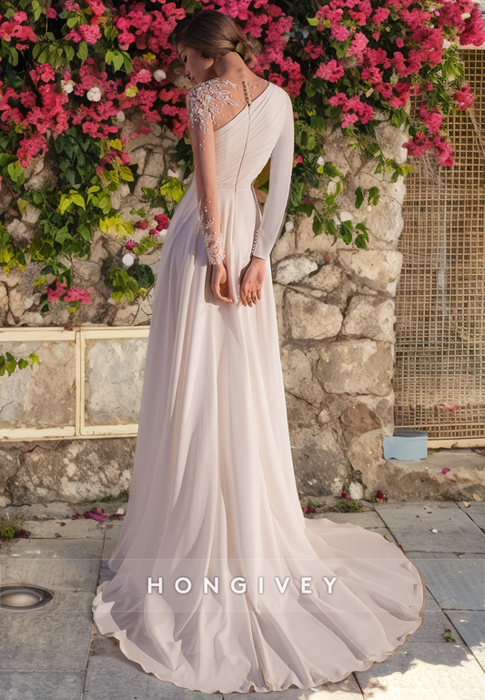 Casual A-Line V-Neck Long Sleeve With Side Slit Sheer Wedding Dress