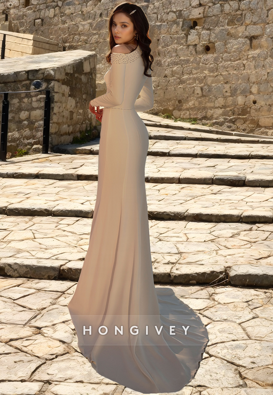 Satin Trumpet Asymmetrical Long Sleeve Beaded Wedding Dress