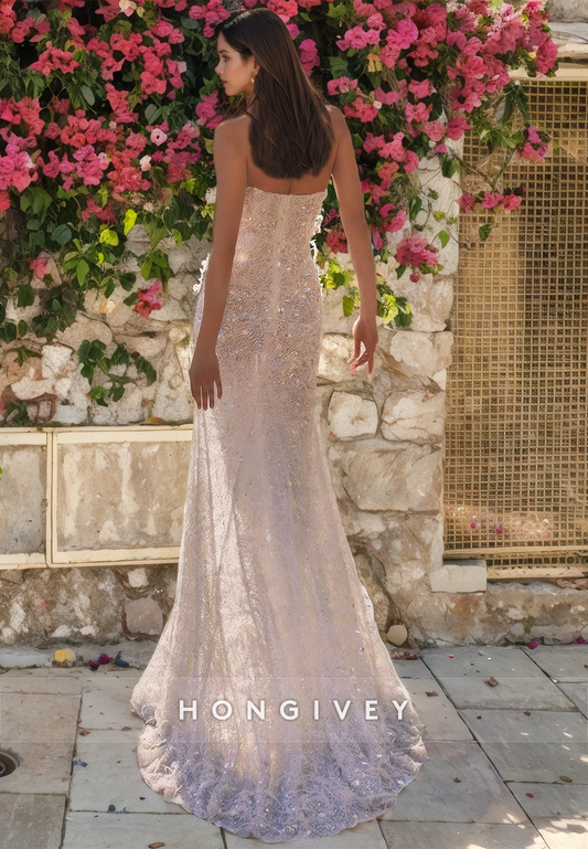 Sheer A-Line Sweetheart Spaghetti Straps Lace Applique High Slit Wedding Dress