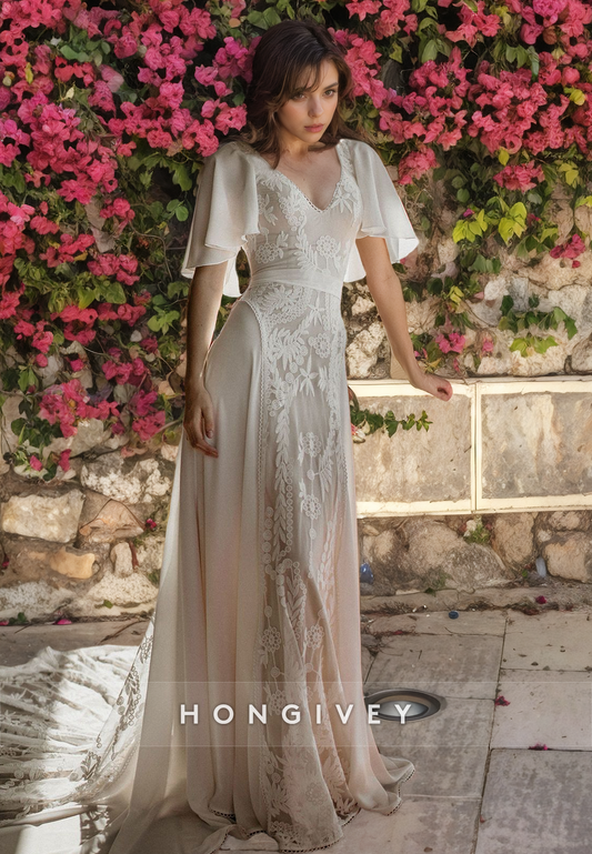 Chic A-Line V-Neck Short Sleeves Lace Applique With Train Boho Wedding Dress
