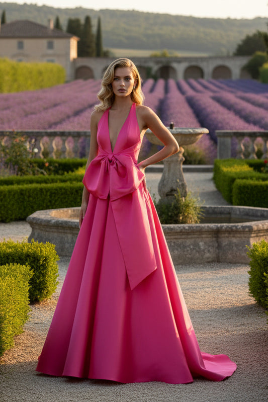 Hot Pink Sleeveless V Neck Satin Gown With Bow Details