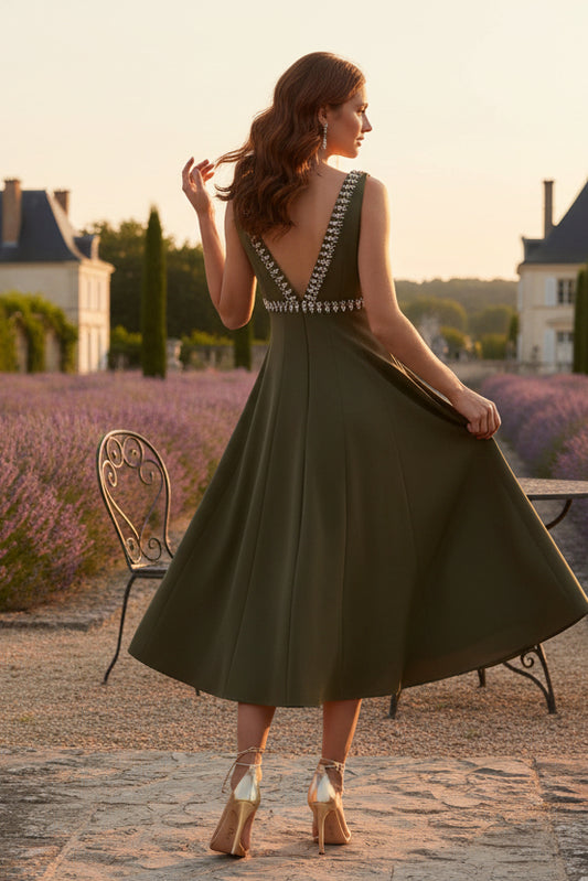 Green Rhinestone Embellished Crepe A Line Midi Dress