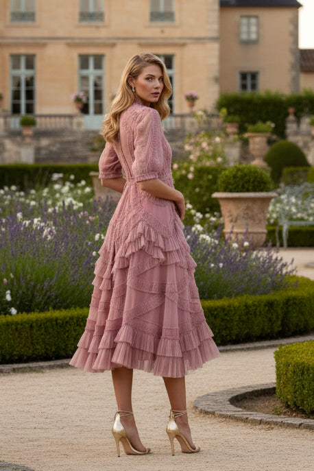 Pink High Neck Ruffle Tiered A-Line Midi Dress