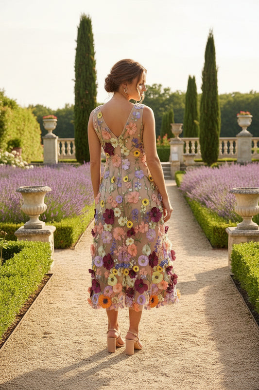 V-Neck Lace Embroidery Cocktail Dresses Floral Tea-Length Sleeveless Formal Dresses