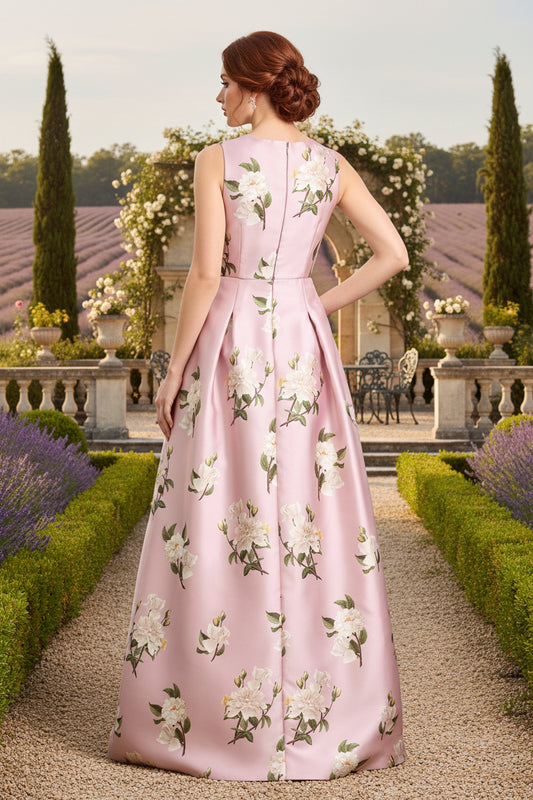 Pink V-Neck Flowers Sleeveless A-Line Evening Dress