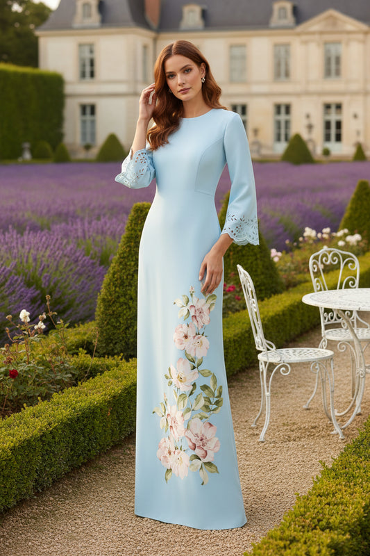 Blue Long Sleeve Flowers Floral Print Evening Dress