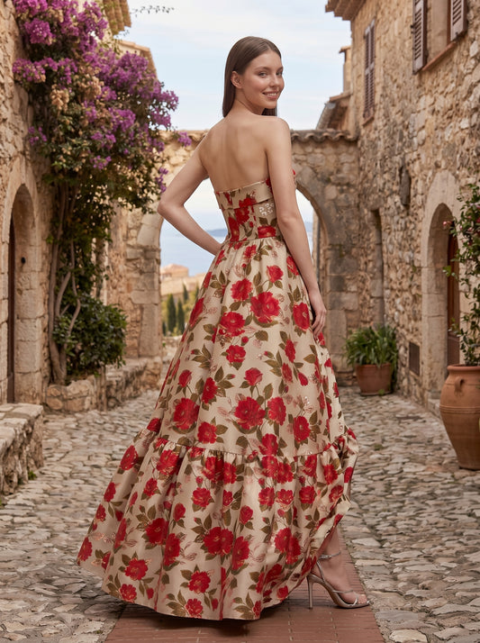 Multicolor Brocade Strapless Floral Gown With Ruffle Hem