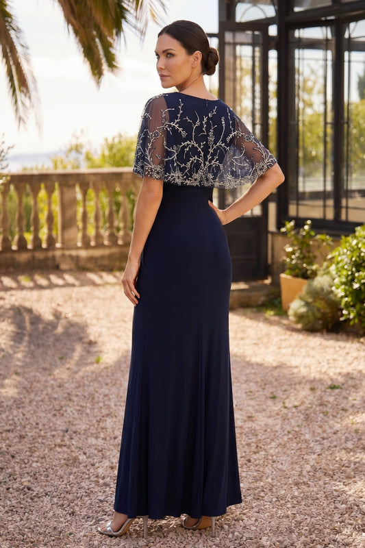 Navy Flutter Sleeve Floral Embroidered Net Evening Dress