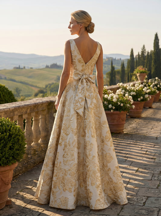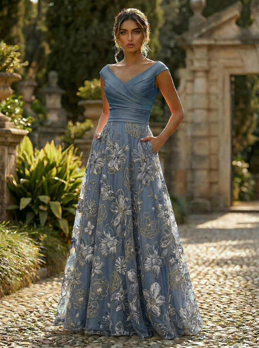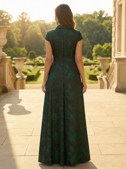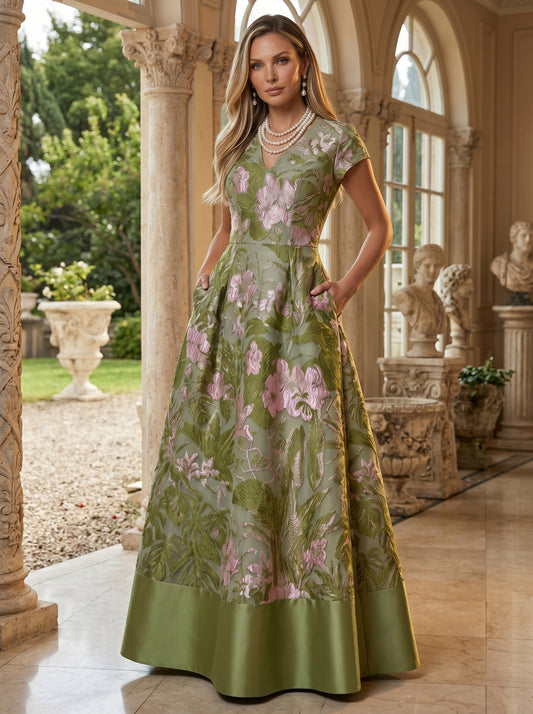 A-Line Floral Jacquard Floor-Length Mother of the Bride with V-Neck, Cap Sleeves