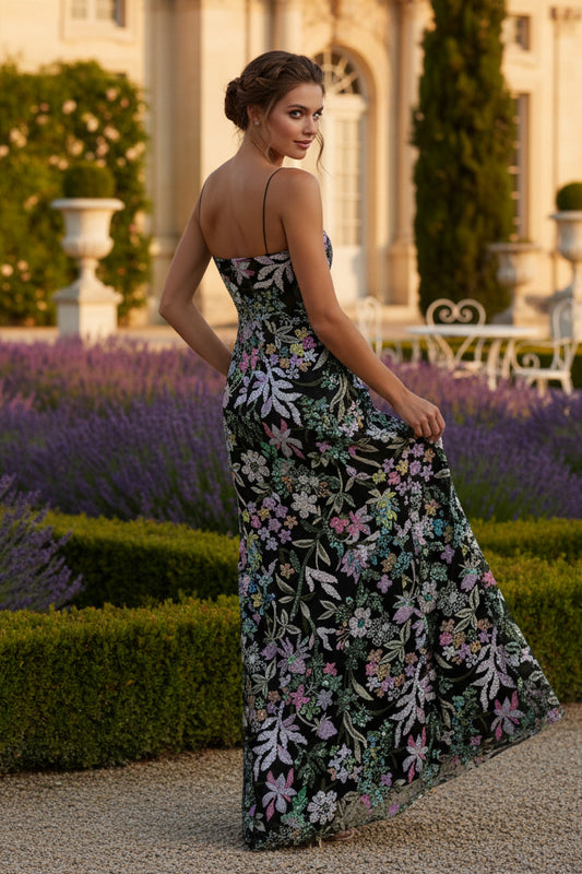 Black Multicolor Floral Embroidered Trumpet Evening Dress