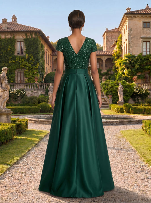 A Line V Neck Short Sleeve Sequined Elegant Mother of the Bride Dresses with Pleats