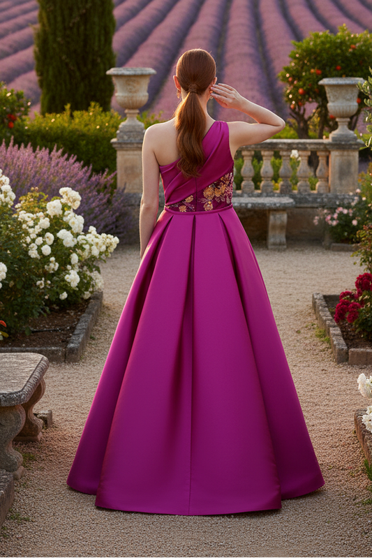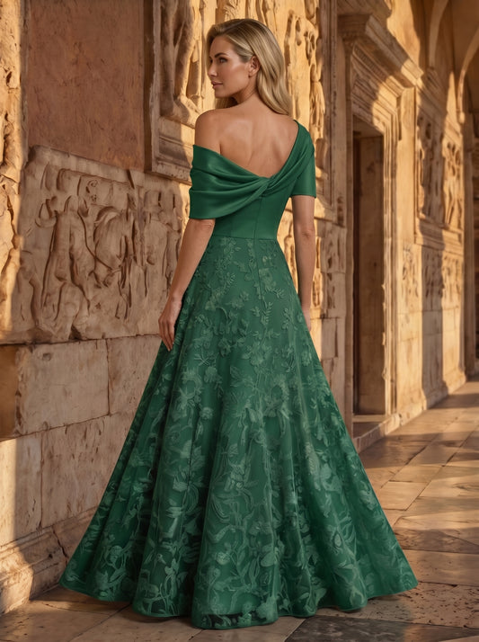 Floral Jacquard One Shoulder A-Line Mother of the Bride Floor-Length Evening Gowns with Bow Pockets