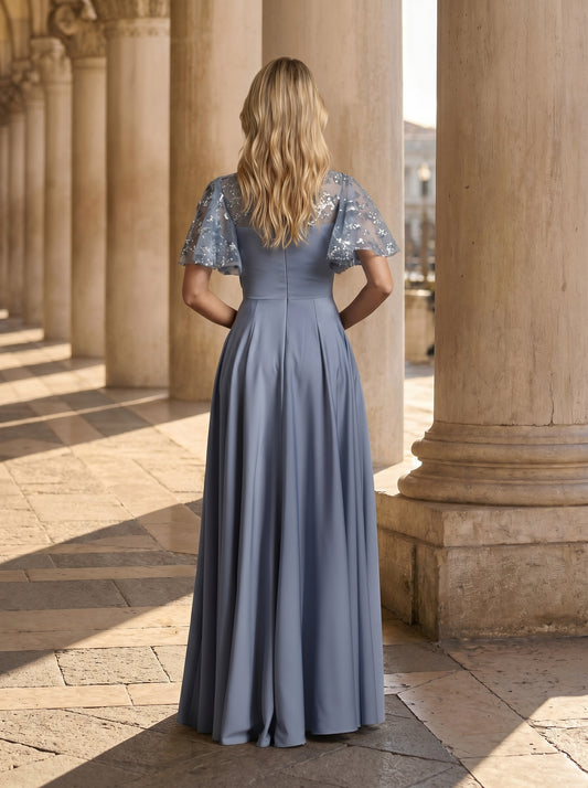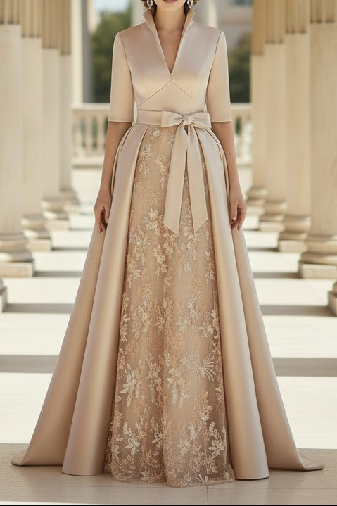 A Line/Princess V Neck Half Sleeve Elegant Evening Dresses with Lace Appliques